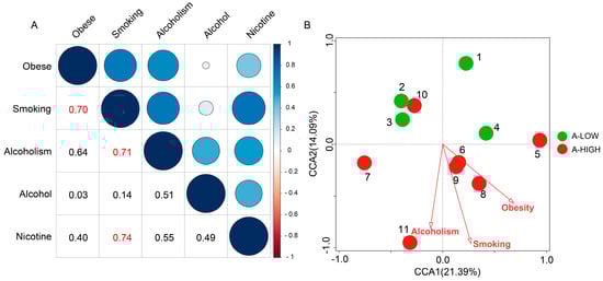 (A) Correlations between individual human health risk factors (alcoholism, obesity, smoking), and between those and chemical biomarker concentration in wastewater (nicotine for smoking, ethyl-sulfate for alcohol) of 11 selected WWTPs. (B) CCA of HUM microorganisms at the genus level. Arrows refer to different health risk factors and the circles represent different WWTPs, in red (high alcoholism rate) or green (low alcoholism rate).