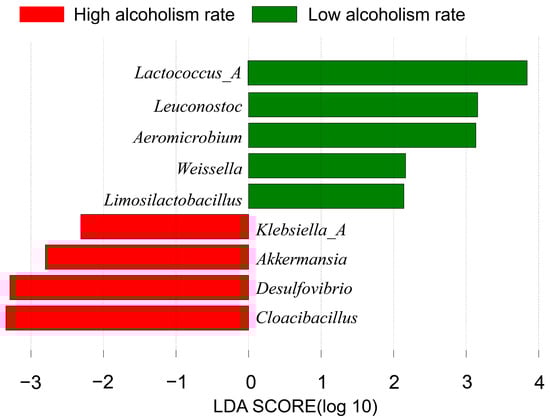 LEfSe analysis identified a total of nine potential biomarkers (Figure 4). Most of them are beneficial bacteria associated with fermentation: Lactococcus, Lactococcus_A, Leuconostoc, Limosilactobacillus and Weissella []. Due to the likely correlation and similar impacts of smoking, obesity and alcoholism on the human gut microbiome, it is imperative to systematically account for and mitigate these confounding effects in the search for alcoholism biomarkers. To identify biomarkers associated with alcoholism, smoking and obesity were employed as secondary classification variables to eliminate their potential confounding effects (Figure S7) []. It was observed that mitigating the confounding impact of smoking showed no difference, while removing the confounding influence of obesity resulted in the exclusion of Lactococcus (Figure S7B).