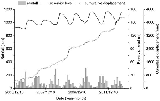 Landslides pose a major geological hazard in China’s Three Gorges Reservoir area (TGRA), threatening infrastructure and human lives [1,2,3,4,5]. Affected by seasonal rainfall and periodic reservoir level fluctuations, step-wise deformations are shown in many landslides in the TGRA [6,7,8,9]. Considering that GPS monitoring records the displacement of numerous landslides in the TGRA [10], predicting displacement is an essential and cost-effective method for early landslide warning and prevention in this area [11,12,13,14].