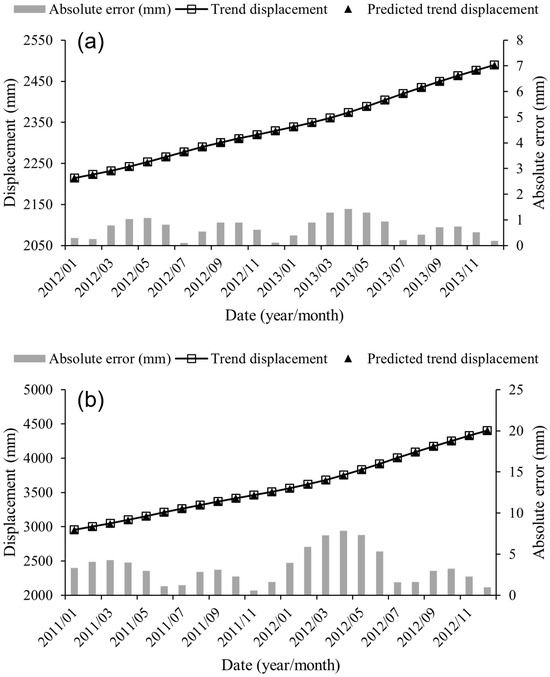Trend displacement prediction results. (a) Baishuihe landslide; (b) Shuping landslide.