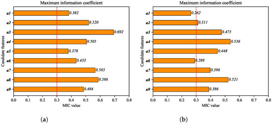 Feature selection results for features from a1 to a9 based on MIC method. (a) Shuping landslide; (b) Baishuihe landslide.