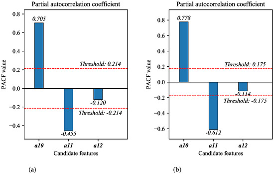 Feature selection results for features from a10 to a12 based on PACF method. (a) Shuping landslide; (b) Baishuihe landslide.