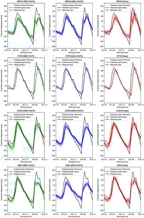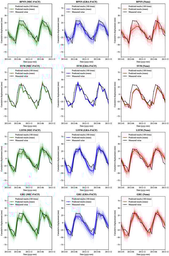 To address inherent randomness, each ML model undergoes 100 independent runs with different preprocessing methods. The periodic displacement prediction results are visualized in Figure 9 and Figure 10 for the Shuping landslide and Baishuihe landslide, respectively. The repetition in experiments produces prediction intervals shown by the light-colored lines for each run. The solid black line depicts the actual monitored displacement data. The dark-colored line represents the average prediction over the 100 runs, with the same colors representing the same feature selection approaches.