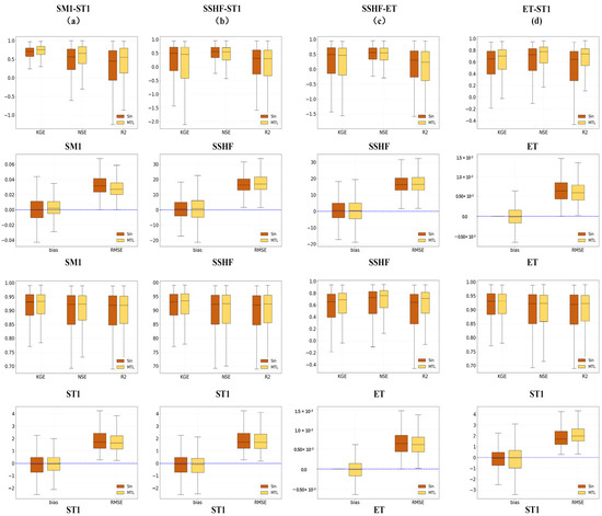 The performance evaluation of the multitask model, which models five different variable combinations, is compared against the single-task model. Evaluation metrics encompass KGE, NSE, R2, Bias, and RMSE. The five variable combinations are as follows: (a) SM1-ST1, (b) SSHF-ST1, (c) SSHF-ET, and (d) ET-ST1.