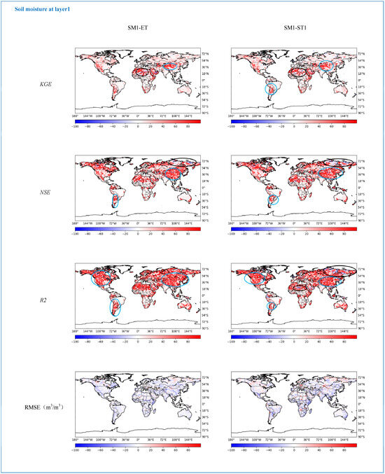 The differential results showcasing the evaluation metrics for the predictive performance of SM1 by the models SM1-ET and SM1-ST1, in contrast to the evaluation metrics for SM1’s prediction by the single-task model, are presented across global grid points. The evaluation metrics utilized for this presentation encompass R2, KGE, NSE, and RMSE.