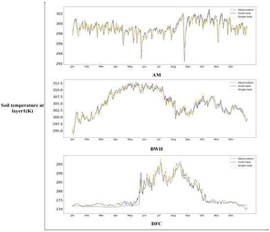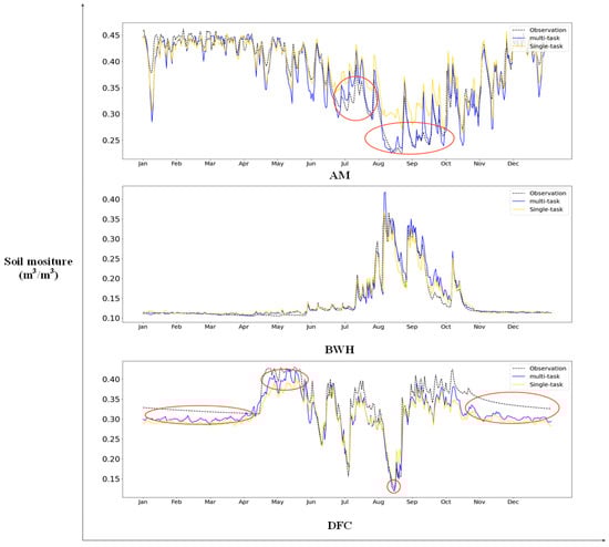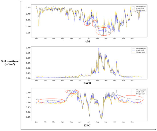 In the DFC region, characterized by harsh winters and consistently low temperatures, weak evapotranspiration results in relatively higher soil moisture. As temperatures rise in summer, evapotranspiration increases, coinciding with seasonal rainfall, leading to a dramatic increase followed by a sharp decrease in soil moisture. Figure 5 and Figure 6 for the DFC region show that, except for the period between June and September, the multitask model consistently outperforms the single-task model in other time periods. However, during the volatile period of intense SM1 observation changes from June to September, the predictive performance of the multitask model does not exhibit significant differences from the single-task model.