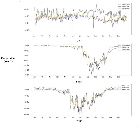 Figure 2 and Figure 3 clearly show that, compared to single-task models, multitask learning models produce more consistent predictions with fewer outliers and extreme values. This advantage stems from the ability of multitask learning to improve prediction stability by learning the interactions between multiple hydrological variables. Additionally, Figure 4 demonstrates that multitask models achieve higher prediction accuracy than single-task models across most global grid points at a resolution of 1°. This improved accuracy is due to the multitask models receiving information from multiple variables, allowing them to capture features more closely aligned with the actual hydrological cycle, thereby enhancing the models’ generalization performance. Furthermore, the 2020 annual prediction analysis for three climatic regions, as shown in Figure 5 and Figure 6 (highlighted by the red circles), demonstrates the multitask model’s sensitivity to seasonal variability in the variables. Moreover, during periods of significant change, the multitask model exhibits far superior predictive performance compared to the single-task model. Compared to single-task models, multitask models can produce predictions that more closely match real data even when data are sparse (Table 3). This advantage offers a new perspective for addressing the issue of limited data for certain specific variables in the field of hydrology.