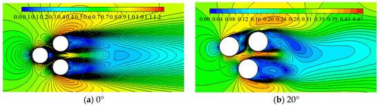 At S/D = 2.5, which is selected as an intermediate spacing ratio, the flow interference is dominated by the suppression between cylinders and interference of the wake. Figure 6 shows the instantaneous velocity contours for flow field at S/D = 2.5 and Re = 8 × 104, with four different incidence angles (β = 0°, 20°, 40°, 60°). The suppression and the gap stream between cylinders dominates the flow field at β = 0°, 40°, just as Figure 6a,c display, but the interference of the wake is significantly affected by the flow pattern at β = 20°, 60°, just as Figure 6b,d display.