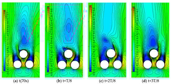 Figure 12 shows the evolutionary process of the periodic flow regime of the wake region within a cycle. Figure 12a shows that the wake region past cylinder C3 deflects to cylinder C1, and the coherent vortex flow past three cylinders communicates with the wake region past cylinder C2; at time t+T/8, the wake region past cylinder C3 enlarges and the wake regions of cylinders C1 and C3 first communicate with each other. At the moment t+2T/8, the shedding vortex of the wake region past cylinder C1 propagates to the wake region downstream past three cylinders, the initial coherent vortex disappears, a small-scale coherent vortex is formed, the wake of cylinder C3 is gradually biased towards cylinder C2, and there is no shedding vortex structure in the wake region of cylinder C2; at the moment t+3T/8, a coherent vortex is formed downstream of cylinder C3 to which the trailing zone of cylinder C1 is connected, the wake region of cylinder C3 is fully biased towards cylinder C2 and is separated from the downstream coherent vortex by the gap flow, and the trailing zone of cylinder C2 is also separated from the downstream coherent vortex. At the moment t+4T/8, the coherent vortex past three cylinders moves downstream, the trailing zone of cylinder C1 starts to separate from the coherent vortex, the initial fusion of trailing zones past cylinders C3 and C2 occurs, and the separation vortex forms at the end of the pile C2 trailing zone; at the moment of t+5T/8, the wake regions of cylinders C2 and C3 are fused, the shedding vortex of the flow field past cylinder C2 is gradually shed and propagates downstream, and the wake region of cylinder C3 starts to deflect; at the moment of t+6T/8, the shedding vortex behind cylinder C2 propagates downstream, a coherent vortex downstream is initially formed, and the wake region of cylinder C3 deflects to the cylinder C1; at the moment of t+7T/8, the coherent vortex scale behind three cylinders enlarges and develops gradually to maturity, the wake region of cylinder C2 is biased towards cylinder C1, the coherent vortex behind three cylinders separates from the wake of cylinder C1, and the wake of cylinder C2 is connected with the coherent vortex.