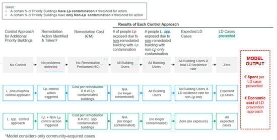 Adapting this model to other jurisdictions would require revising, and, as needed, changing, the geography-specific inputs described in Section 2.4, Section 2.5 and Section 2.6. This would include, for example, the type of number of buildings controlled, the number of people potentially exposed per building, building contamination estimates, estimates of the proportion of L. pneumophila and non-pneumophila species found in buildings, Legionnaires’ disease incidence rates factoring in country-specific underestimation factors, and local costs for remediation, hospital care, and/or productivity losses.