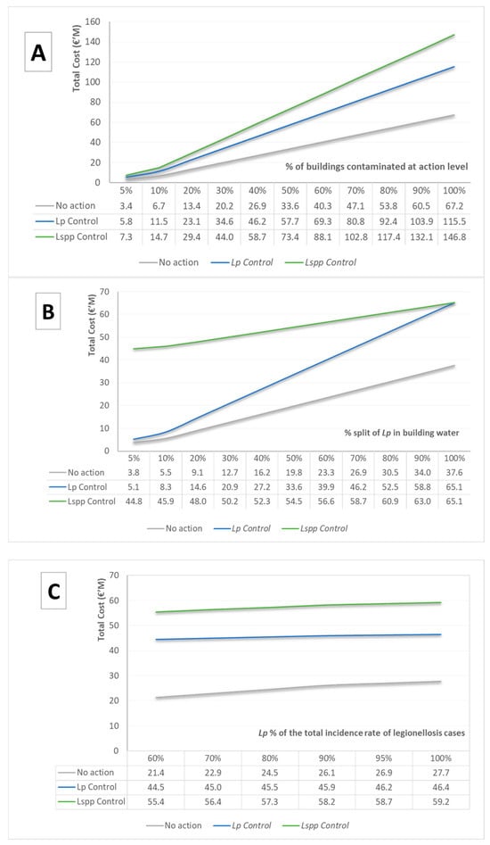 The difference in relative cost between the two control approaches was most sensitive to changes in two specific variables: “% of contaminated buildings with L. pneumophila detection” and “rate of compliance with remediation when the action limit is exceeded”. When the percentage of buildings for which a remediation action was taken was varied, the Legionella spp. control strategy consistently led to a higher cost (Figure 5B). However, when L. pneumophila represented the minimum of over-action-limit samples (only 5%), there was a substantial difference in cost between the two strategies, EUR 35 M per year, or 770%. When L. pneumophila was 90% of over-action-limit contaminations, the difference was much less, although still notable at EUR 4 M or 7%. At all rates of building owner compliance with the requirements to take remedial action as a result of Legionella detected above the action limit, the total costs were consistently higher for the Legionella spp. control strategy (Figure 5E). Yet the cost of an Legionella spp. strategy was estimated at EUR 1.6 M higher per year than an L. pneumophila strategy when 5% compliance with the remediation requirement was assumed, and more than EUR 31 M higher each year, 42% higher, at 100% compliance, when public health policies were assumed to be fully implemented.