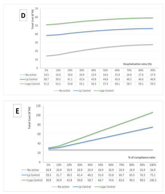 However, in terms of total cost to society, the L. pneumophila control strategy was consistently advantageous regardless of the variable tested (Figure 5A–E).