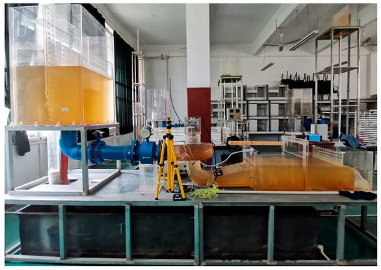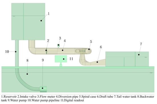 To determine the discharge noise characteristics of conventional hydraulic turbines under different operating conditions, the discharge noise monitoring test is performed using the laboratory model Francis turbine energy test bench (Table 1). The turbine energy test bench is mainly composed of the upstream reservoir, the diversion pipe, the turbine passage, the tail water tank, the return water tank, and the operating table, as shown in Figure 1 and Figure 2. The head of the upstream reservoir, the discharge flow rate of the runner, and the rotor speed can be controlled by adjusting diversion pipeline valve openings, the opening of the guide vane, and the load of the rotor, respectively. The instantaneous runner speed, torque and power, and other related parameters can be recorded during the test.