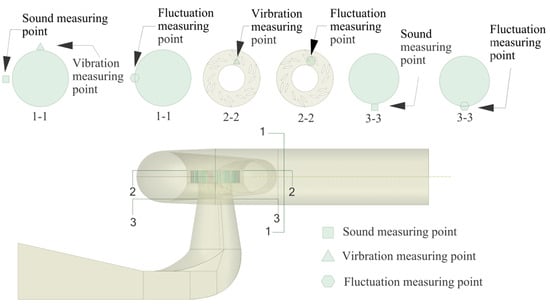 With the modifications in operating conditions, the internal flow field and the noise field of the turbine passage will also change accordingly, especially for the flow components with severe turbulence and large pressure gradients, such as the spiral case, distributor, runner, and draft tube. To better distinguish the hydrodynamic correlation between the discharge noise at these flow components and the flow field, acoustic monitoring must be conducted in these areas. Noise measurement involves budget estimation, engineering, and precision methods [20]. In the experiment, the engineering method was used to monitor the discharge noise. The acoustic monitoring measuring points were arranged at the inlet section of the spiral case and the outlet section of the runner, which were 2 cm away from the side wall (Figure 3). The acoustic sensor was calibrated before the acoustic measurement. When the turbine discharge process reached stability, the noise monitoring was carried out with a duration of 20 s. To minimize the influence of background noise on the discharge noise, the test was carried out in the late night with the weakest background noise. The background noise of the test environment was mainly low-frequency noise below 200 Hz. The test showed how discharge noise changed with operating conditions, so the influence of background noise could be ignored.