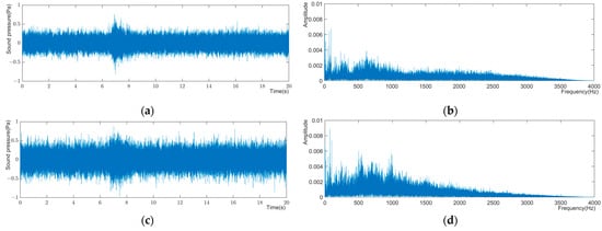 (a) Time domain diagram of acoustic signal at the spiral case inlet in Condition 3; (b) frequency domain diagram of acoustic signal at the spiral case inlet in Condition 3; (c) time domain diagram of the acoustic signal at the runner outlet in Condition 3; (d) frequency domain diagram of the acoustic signal at the runner outlet in Condition 3.