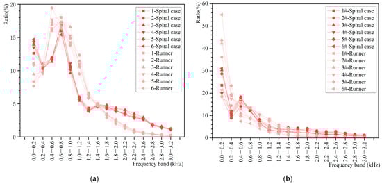 The acoustic signal energy ratio diagram (the distribution ratio of acoustic signal in different frequency bands) of the measuring point in the spiral case inlet area and runner outlet area under different working conditions (Figure 5) indicates that in the low-frequency band, which is prone to accidents, the energy of the runner outlet area is larger than that of the spiral case inlet area when the valve opening is small. Therefore, the flow state of the runner outlet area is the main source of the turbine discharge noise.