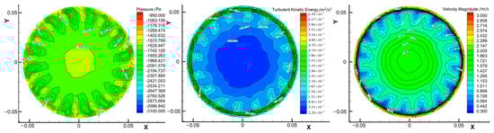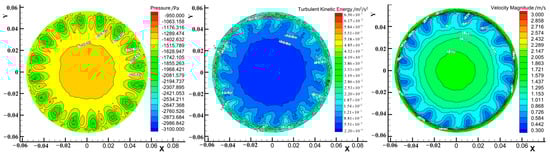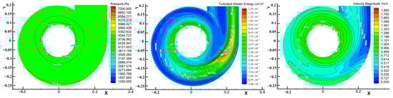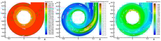 Under the same operating conditions as the turbine, the water flow in the runner outlet area converges from the outer edge to the center of the runner, whereas the flow velocity below the gap between the runner lower ring and the runner chamber wall is larger (Figure 8 and Figure 9). Consequently, the flow velocity at the corresponding position between the runner blades heightens, and the flow velocity under the blade declines. The turbulent kinetic energy at the outer edge of the runner outlet area exhibits a gradient of decreasing trend to the center of the section.