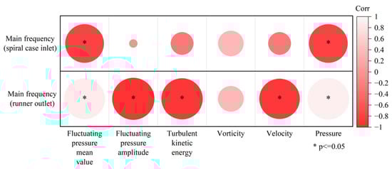 The same method is used to identify the key hydrodynamic factors affecting the main frequency of the discharge noise. It is found that the relationship between the main frequency of the discharge noise and the hydrodynamic factors differs from that of the SPL (Figure 11). The main frequency of the discharge noise in the spiral case inlet area is negatively correlated with the mean fluctuating pressure and pressure, and the main frequency of the runner outlet area is significantly positively correlated with these. The dominant frequency is significantly negatively correlated with fluctuating pressure amplitude, turbulent kinetic energy, and flow velocity. With the decrease in the mean fluctuating pressure and pressure in the runner outlet area, the fluctuating pressure amplitude, turbulent kinetic energy, and flow velocity increase continuously, indicating that the turbine’ operation is more unstable. The unit operates under unfavorable hydraulic conditions. At this time, the SPL in this area increases, and the water flow is prone to form low-frequency vibration, which may affect the operational safety of the unit.