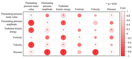 Through the analysis of the key hydrodynamic factors that affect the discharge noise in different regions of the turbine, the hydrodynamic factors of the flow passage and their distribution greatly affect the discharge noise. To determine the influence of different hydrodynamic factors on the characteristic value of the discharge noise and their relationship, the Pearson product–moment correlation coefficient is used to identify the relationship between the hydrodynamic factors and the noise characteristic values.