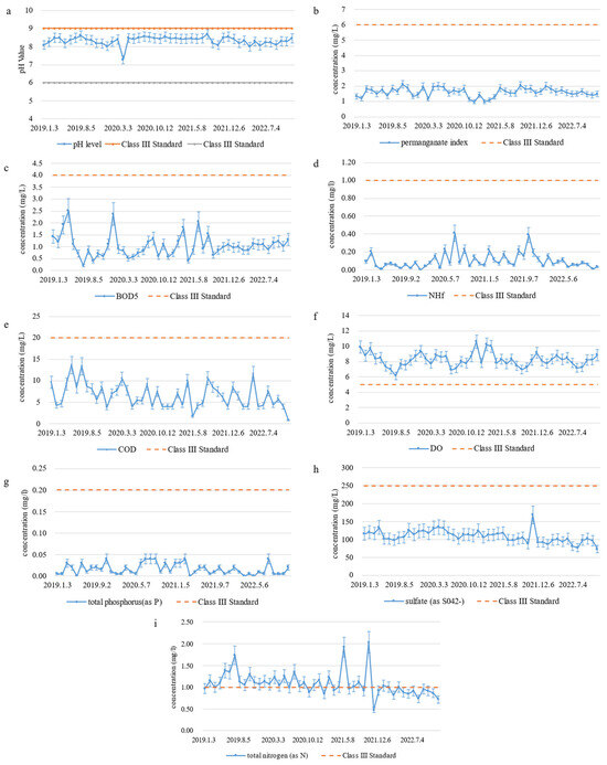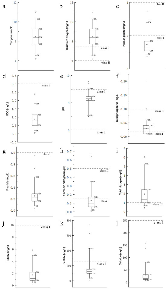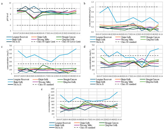 - Water-Quality Evaluation of Intake Points: The results indicate that the overall water quality in the intake area is good, with most indicators meeting Class III water-quality standards. However, there are instances of excessive total nitrogen and sulfate levels, particularly in Baijia Valley, where sulfate and dissolved solids concentrations exceed the standards to a considerable extent. Therefore, further efforts are needed to enhance water environment management and governance.