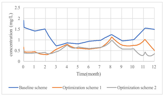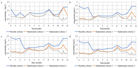 - Water-Quality Simulation Results: The simulation results reveal that using the design water intake volume specified in the “Preliminary Design of Urban and Rural Drinking Water Safety Source Project 2012,” the predicted annual total nitrogen concentration in Zhongzhuang Reservoir exceeds the standards throughout the year, with an over-standard rate of up to 52.89%. After the optimization scheme was adopted, the annual predicted total nitrogen concentration in Zhongzhuang Reservoir significantly decreased, with the maximum reduction rate reaching 78.81% and all simulation results meeting the Class III standards of the “Environmental Quality Standards for Surface Water”.