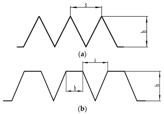 Walsh et al. [20] revealed that the bionic groove geometry has drag reduction properties with dimensionless height h+ ≤ 25 and width s+ ≤ 30. Based on this, the dimensionless height h+ and width s+ were both chosen to be 12 in this work. According to Equations (1) and (2), we can obtain s = h = 0.3 mm. In order to accurately compare the effects of the two bionic groove geometries on the performance of the centrifugal pump and reduce the effect of variances, the Space-V-groove dimensions are taken to be s = h = b = 0.3 mm.