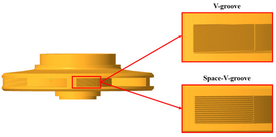 The most studied bionic groove geometries are V-shaped, U-shaped, L-shaped, and Space-V-shaped [12]. Researchers have studied different types of bionic groove geometries to some extent, but there are fewer comparative studies on different bionic groove geometries in centrifugal pumps. Therefore, this work investigates the effect of V-groove and Space-V-groove geometries on hydraulic performance and acoustic characteristics. Figure 1 shows the two bionic groove geometries.