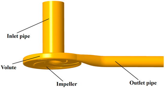 The computational domain is shown in Figure 3. Extended straight pipes were added at the impeller inlet and volute outlet to ensure a steady flow into the impeller without backflow. Meanwhile, the monitoring points of the internal flow field and internal sound field can correlate with the positions of the pressure pulsation sensor and hydrophones to better compare the simulation results with the test results.