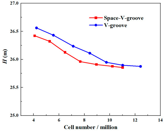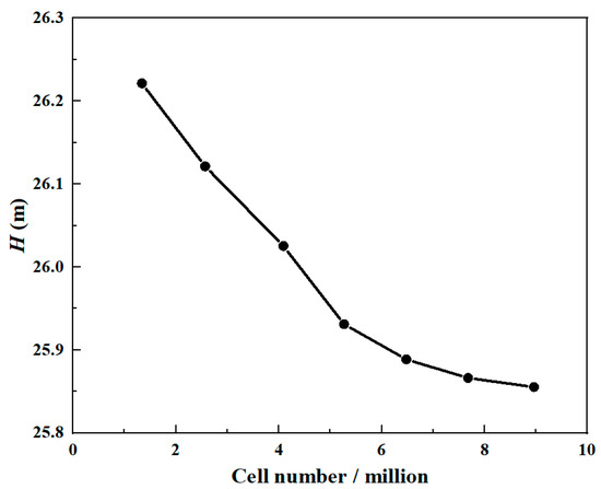 Due to the tiny size of the grooves, it is challenging to build blocks for hexahedral meshing, which may cause low mesh quality. Moreover, considering that the bionic impellers need to be compared with the smooth model, the meshing method needs to be unified. Therefore, this paper adopted a tetrahedral grid to mesh the computational domain. When the numerical simulation of the flow field is carried out, the influence of the cell number on the accuracy and the time cost of the results needs to be considered comprehensively. A small number of cells can lead to low accuracy of calculation and an inability to capture the flow field variations correctly. Too many cells will lead to long computing time and unnecessary cost of resources. Hence, grid-independent verification is required to obtain an appropriate set of cells to capture the flow field variation accurately and minimize computational time costs. This work carried out grid-independent verification for seven sets of grids, and the heads of the prototype pump at each cell number are shown in Figure 4. The head is gradually stabilized at a cell number of 7.8 million, which is sufficient for numerical simulation.