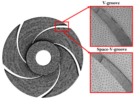 It is necessary to increase the mesh density of the bionic groove to accurately capture the flow structure at the bionic surface. The heads of the two bionic pumps with different numbers of grids are shown in Figure 5. The head tends to stabilize at a cell number of about 10 million for the V-groove pump. Furthermore, for the Space-V-groove pump, the number of cells needed is around 9 million. Therefore, these two sets of grids were selected for the study. The maximum cell size of the impeller is set to 1.3 mm, and the cell size of the groove surface is set to 0.3 mm. The height of the boundary layer grid is set to 0.1 mm, and the maximum y+ is controlled to be less than 80. The bionic impeller and the local mesh of the grooves are shown in Figure 6.