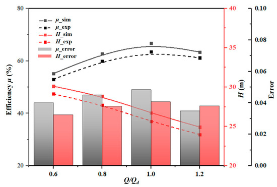 Figure 8 shows the results of the external characteristics of the prototype centrifugal pump for simulation and testing. The trends of head and efficiency with flow rate obtained from the test and simulation are consistent. Under the rated working condition, the simulated and tested heads are 26.72 m and 25.63 m, respectively, with an error of 4.08%; the efficiencies are 66.71% and 63.47%, respectively, with an error of 4.84%. In other working conditions, the head error is within 4%, and the efficiency error is within 5%. Therefore, the simulation method established in this paper has high accuracy.