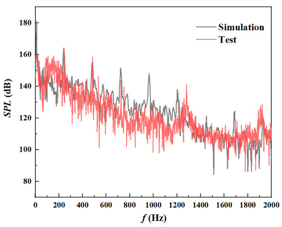 Figure 9 displays the numerical simulation and test comparison of the sound pressure level (SPL) at the outlet of the inner sound field. The test results follow the same trend as the simulation results, with the main frequency at the blade pass frequency (BPF, 241.7 Hz). The test values are higher than the simulation below the BPF, while the opposite is valid after the BPF. The error in the broadband may be due to the simulation ignoring the scattering of the flow noise on the pipe wall.