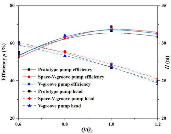 Figure 10 compares the hydraulic performance of the bionic grooved centrifugal pump and the prototype centrifugal pump. The head and efficiency of the two bionic grooves and the prototype centrifugal pumps show the same trend. In addition, bionic centrifugal pumps have lower heads than prototype centrifugal pumps at 0.6 Qd. As the flow rate increases, the head of the bionic pump begins to be higher than the prototype centrifugal pump. The head difference between the bionic and prototype pumps reaches its maximum at 1.0 Qd. The head difference between the Space-V and V-groove models and the prototype model are 0.66 m and 0.23 m, respectively. The head difference becomes smaller when the flow rate increases to 1.2 Qd. In this case, the Space-V and V-groove models are 0.58 m and 0.24 m, respectively. The Space-V-groove has a high effect on the head and remains effective at flow rates higher than 0.8 Qd. In contrast, the V-groove improves the head of centrifugal pumps at the design flow rate less significantly than the Space-V-groove.