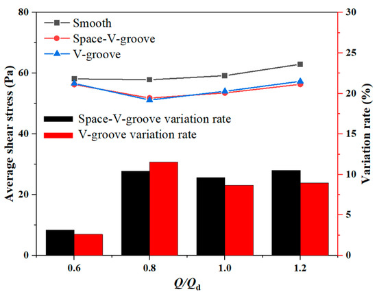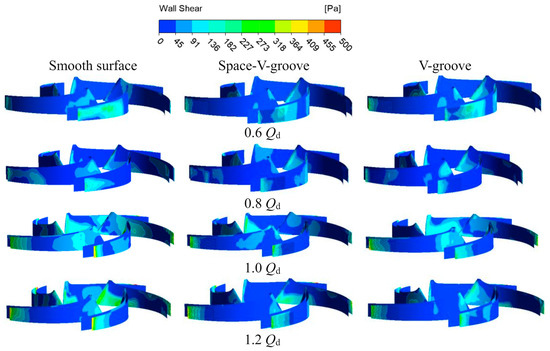 Figure 12 shows the average shear stress on the blade’s surface. The wall shear stress of the smooth blade increases with increasing flow, while the wall shear stress of both bionic groove blades first decreases and then increases. The shear stress of the Space-V-groove blade is slightly higher than the V-groove at 0.6 Qd. Furthermore, at 1.0 Qd, the average wall shear stress is reduced by 9.59% for the Space-V-groove blade and 8.68% for the V-groove blade. As the flow rate increases to 1.2 Qd, the impact of the Space-V-groove on shear stress remains larger than that of the V-groove model, which is consistent with the torque trend.