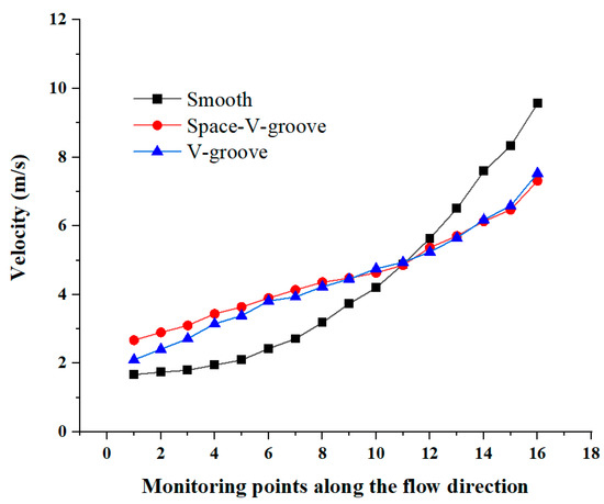 Sixteen velocity monitoring points were set at the same position along the flow direction on the grooved and smooth blade surfaces to more clearly compare the influence of the two bionic groove geometries on velocity. The 16th monitoring point is at the outlet position of the blade. The variation of velocity along the flow direction for different blades is shown in Figure 13. The bionic groove geometry reduces the velocity and its gradient near the blade outlet. It indicates that both bionic groove geometries achieve drag reduction by reducing the velocity gradient of the viscous layer. The Space-V-groove model has slightly less velocity and gradient at the blade outlet than the V-groove model.