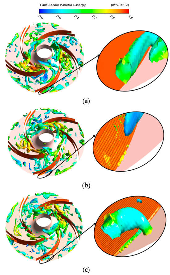 The Q-criterion is based on the complex imaginary part of the eigenvalues of the velocity gradient tensor. The larger the Q-value, the closer to the vortex core. This paper selects Q = 0.1 for the vortex structures inside the different impellers. The vortex cores inside the three impellers are shown in Figure 14. The vortex cores inside the bionic groove impeller decrease compared with the prototype pump. It indicates that the bionic groove geometry on the blade surface can improve the flow behavior and reduce energy loss. Particularly in the marked area, both bionic groove geometries disrupt the vortex structure on the blade surface, which can reduce the acoustic power in the pump. Space-V-groove decomposes the vortex more significantly on the blade surface compared to V-groove.