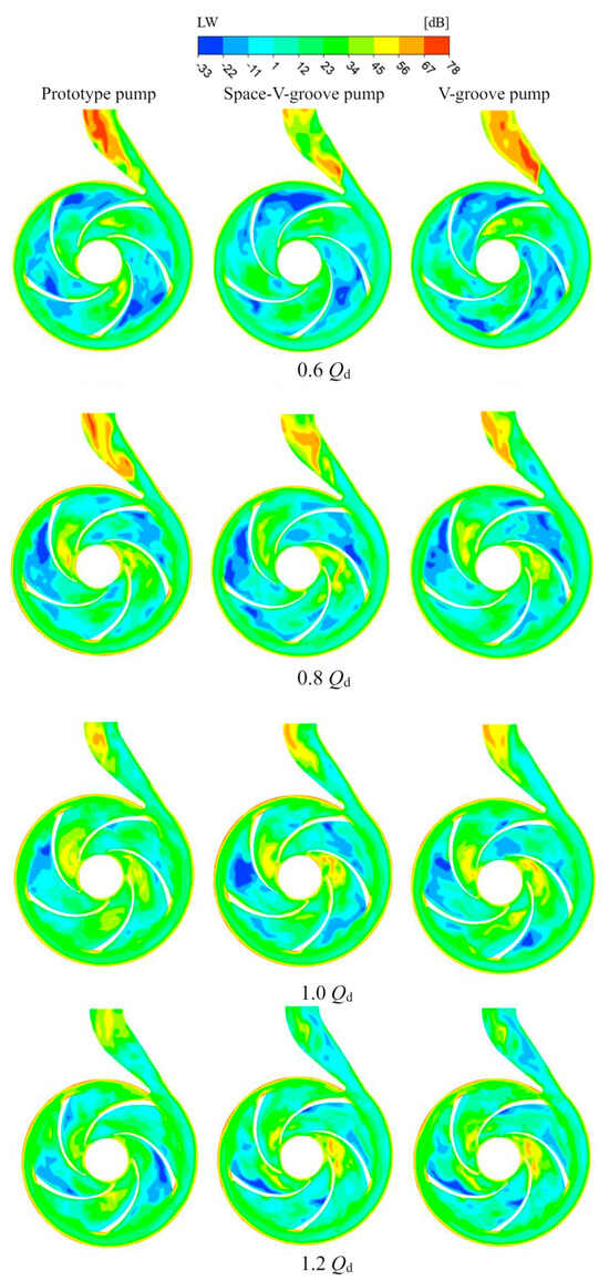 The acoustic power of three pumps at different operating conditions is shown in Figure 15. The high acoustic power area inside the pump is primarily located in the volute diffusion section. The turbulent kinetic energy is severe due to the rotor–stator interference, so the acoustic power level is relatively high near the interface between the impeller and the volute. The acoustic power in the volute diffusion section decreases with increasing flow rate. Since the rotor–stator interference at high flow rates is not as distinct as at low flow rates, and the flow behavior in the pump under high flow rates is stable, the energy lost is relatively low. Under different operating conditions, the acoustic power level in the channel of the bionic groove impeller is lower than that of the prototype impeller. Meanwhile, there is a localized low acoustic power region at the blade working surface. Notably, at the rated flow rate, the Space-V-groove impeller has a larger area of low acoustic power region in the flow channel compared to other impellers, which is consistent with the vortex core distribution feature. Therefore, it shows that the Space-V-groove can effectively reduce the turbulence inside the impeller, hence the acoustic power in the flow channel.
