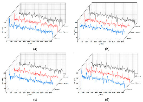 Figure 16 illustrates the frequency response of the outlet sound pressure level. The internal field noise of the three pumps shows broadband noise in the entire frequency band, and the sound pressure level decreases with increasing frequency. Moreover, there are apparent characteristic peaks at the blade pass frequency (BPF, 241.7 Hz) and harmonics.