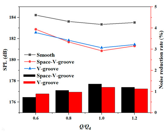 To compare the noise reduction ability of both bionic groove geometries, the total sound pressure level of each pump at different flow rates is calculated according to Equation (5). The total sound pressure level and noise reduction rate are shown in Figure 17. The total sound pressure level of both bionic pumps and the prototype pump tends to decrease and then increase with the flow rate. The flow behavior is stable at the rated flow rate, making the total sound pressure level minimum. The pump’s efficiency is lower under partial working conditions, and the lost energy is partially converted into sound energy, resulting in a higher total sound pressure level. Both bionic groove geometries reduce the total sound pressure level by approximately 0.71% to 1.36%. At a low flow rate of 0.6 Qd, the V-groove reduces the total sound pressure level better than the Space-V-groove by 0.89% for the V-groove and 0.73% for the Space-V-groove. As the flow rate increases, the Space-V-groove pump gradually outperforms the V-groove pump in reducing the total sound pressure level. The two bionic groove geometries show the best noise reduction at rated flow rates, with the Space-V-groove reducing 1.36% and the V-groove reducing 1.2%.
