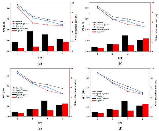 The bionic groove geometry not only has an effect on the broadband noise but also reduces the discrete noise at each characteristic frequency. The discrete noise of the three models under different operating conditions is quantitatively analyzed, as shown in Figure 18. Both bionic groove geometries reduce the sound pressure level at the characteristic frequency. At the BPF, 2 BPF, and 4 BPF, the noise reduction effects of the two bionic groove geometries are equivalent. The noise reduction of the Space-V-groove is significantly better than the V-groove at 0.6 Qd. At the 3 BPF, the Space-V-groove has a relatively effective noise reduction at all operating conditions. Therefore, both bionic trench geometries can reduce the total sound pressure level, and the Space-V-groove provides better suppression of the total sound pressure level than the V-groove.