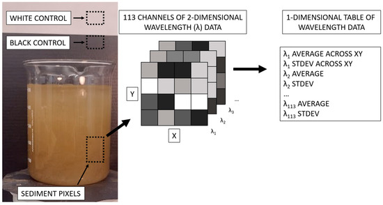 Figure 2 shows the location of the three image subsets. For 113 channels, the average and standard deviation across the pixels were recorded in a table (113 × 2 = 226 recorded values). This process was repeated for the sediment, white control, and black control data, resulting in 678 recorded values per image.