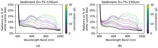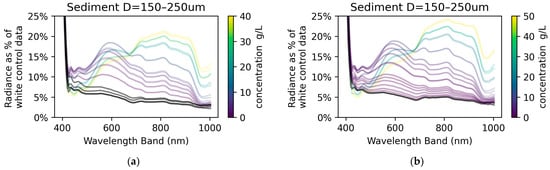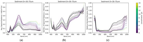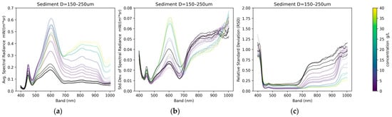 Figure 5c) show that the bands of 400–430 nm have large variations regardless of sediment size and concentration. Bands 430–680 nm (visible light) show little variation relative to the average values. Bands 680–1000 nm have higher variation at low concentrations, but the variation decreases as the sediment concentration increases. This trend can be explained by the sediment scattering light in the 680–1000 nm bands, and a higher concentration causes greater reflection, and the signal becomes stronger relative to the standard deviation and more homogeneous.
