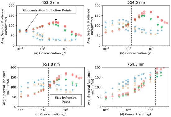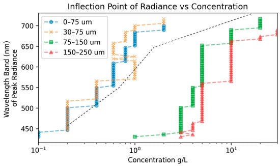 Figure 9 shows the inflection points or maximums for each wavelength and size. For the concentrations associated with each point, lower concentrations have a positive correlation with radiance. We note that the bands 400–430 nm have noise; ignoring these bands shows a general trend toward greater wavelength bands having higher inflection points for larger concentrations. As seen in