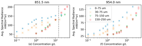 Figure 8. For the selected wavelength bands, the hyperspectral spectra show different behaviors depending on sediment sizes and concentration. Considering particle sizes, two regions can be identified depending on the correlation between radiance and particle sizes, which can be defined as positive and negative correlation regions. For a wavelength of 452 nm, only a positive correlation region is present, while with higher wavelengths, the negative correlation region extends from low concentrations to high concentrations. At the highest wavelength of 954 nm, only a negative correlation region is present. This observation can be used to design algorithms to determine particle sizes using water color.