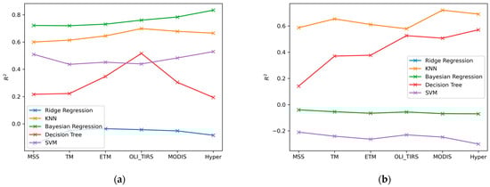 Figure 10b). The K-Nearest Neighbors Regression model stands out for its consistent performance across all band configurations, demonstrating its adaptability to diverse spectral features. The Decision Tree Regression shows significant improvement upon more accurate and more available bands. The Bayesian Ridge Regression became the same as Ridge Regression, as the prior did not impact the modeling process. SVM Regression models show the worst performance, probably due to the limitation of training data.