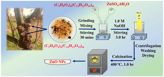 A solution of GA (40 mL, 1.0% (w/v)) was added to 50 mL of 0.1 M ZnSO4 6H2O. The mixture was subjected to stirring for 30 min. The pH of the mixture was adjusted to 10 by slowly adding a 1 M NaOH solution. Subsequently, it was agitated for 180 min at room temperature. The colloidal solution acquired underwent a 24 h aging process at room temperature and was collected by centrifugation. The resultant product was washed with C2H5OH and distilled water, ensuring no impurities remained, and then dried at 45 °C in an electrical oven. The dried sample underwent calcination for 1 h at 400 °C using a muffle furnace [44]. Figure 1 shows the synthesis method for the ZnO NPs using GA material.