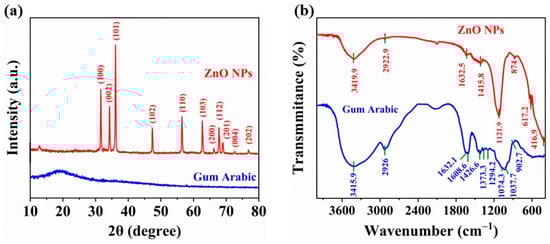 (a) XRD patterns and (b) FT-IR spectra of Gum Arabic (GA) and ZnO NPs.