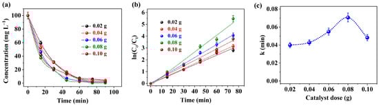 (a) Effect of different catalyst doses on photodegradation of 30 mg L−1 of CR dye at room temperature and pH = 8. (b,c) Effect of different catalyst doses on rate of photodegradation constant (K) of 30 mg L−1 of CR dye at room temperature, and pH = 8. Error bars represent the standard deviations of duplicate runs.