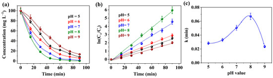The pH level is an essential factor in the photocatalytic degradation process [62]. It can be significantly affected by the size of particles, the charge on their surfaces, and where the boundaries of the valence and conduction bands are located [63]. The tested pH range was 5–9, as shown in Figure 6a, and the effect of pH on the rate constant (k) is listed in Figure 6b,c. The dye’s percentage of photodegradation led to an increase in free hydroxyl radical production, which raised the pH to 8. On the other hand, the dye’s photodegradation rate declined above a pH of 8, which may be due to the catalyst’s propensity for corrosion [64]. The rationale for this phenomenon is derived from the photocatalyst’s point of zero charge (PZC). Therefore, the surface charge was studied by assessing the PZC. The results revealed that the pHPZC is 8.4 (Figure S1), where above this pH value, the catalyst system will be negatively charged, and the result was confirmed from the results of different pH experiments. As shown in the effect of the pH findings, the photodegradation activity was reduced dramatically by increasing the pH value above pH 8, and this was attributed to the repulsion between the negatively charged catalyst surface at this point with the anionic CR dye, which is negative in nature [54]. Thus, the findings highlighted the crucial role of adsorption. Hydroxyl radicals are the main oxidizing species that break down materials through photocatalysis. The positively charged surface of ZnO NPs and the negatively charged CR dye interact electrostatically, which produces more hydroxyl radicals [65].