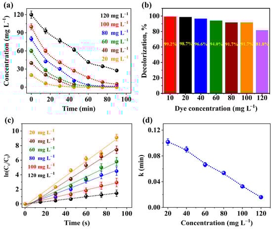 (a) Effect of dye concentration on photodegradation percentage at different concentrations. (b) Percentage of decolorization vs. dye concentration. (c,d) Rate constant of CR dye at room temperature and pH = 8 and contact time = 90 min. Error bars represent the standard deviations of duplicate runs.